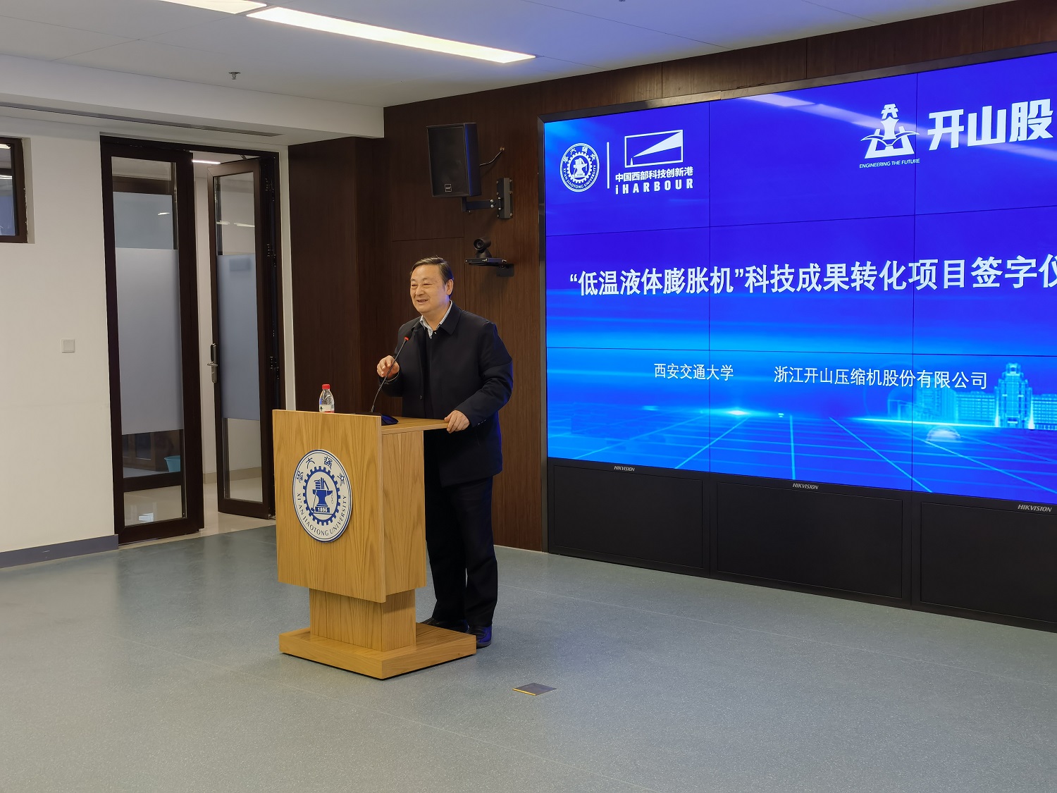 12月23日下午,在西安交通大學副校長王鐵軍和浙江開山壓縮機有限公司董事長曹克堅見證下,西安交大科研院常務副院長黃忠德與開山壓縮機公司副總經理楊建軍分別代表雙方簽署“低溫液體膨脹機”科技成果轉化項目協議書。雙方將在西安交大創新港設立由開山股份控股的創新平臺公司——開山透平有限公司(KAISHAN TURBOMACHINERY CO.LTD.),旨在研發包括低溫液體膨脹機”在內的透平機械產品。